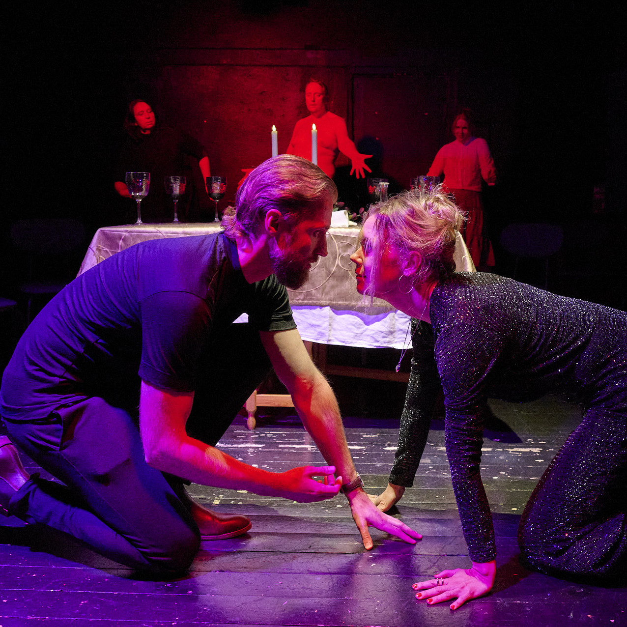 Ett scenkonstverk i kortformat med fyra skådespelare, där röster, kroppar och musik möts.